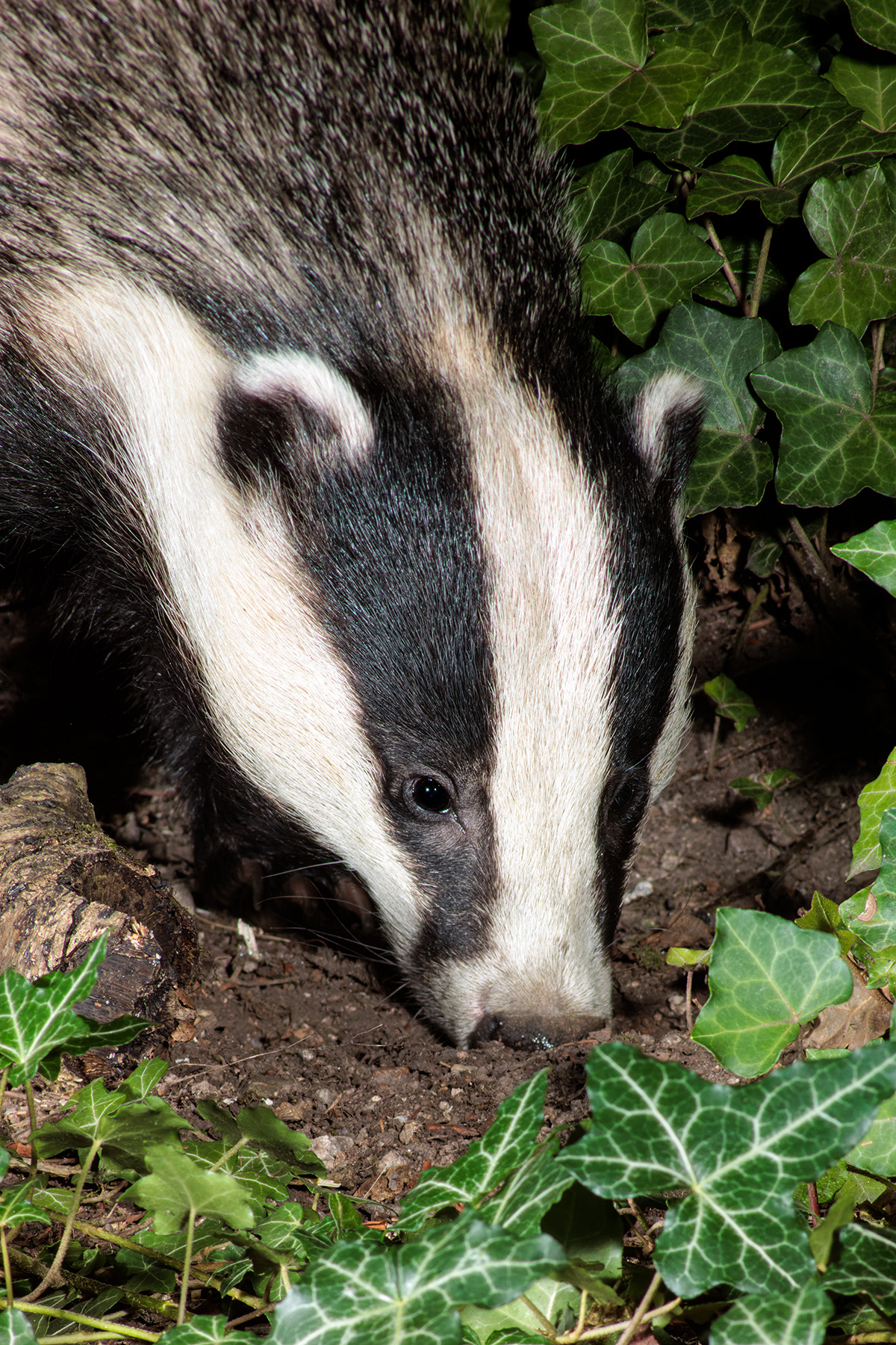 This photo of a foraging badger was taken with a small mirrorless camera, a 40-year-old telephoto lens, and a DIY tilt/shift adapter used to tilt the plane of sharpest focus through the badger's snout, eyes and ears.