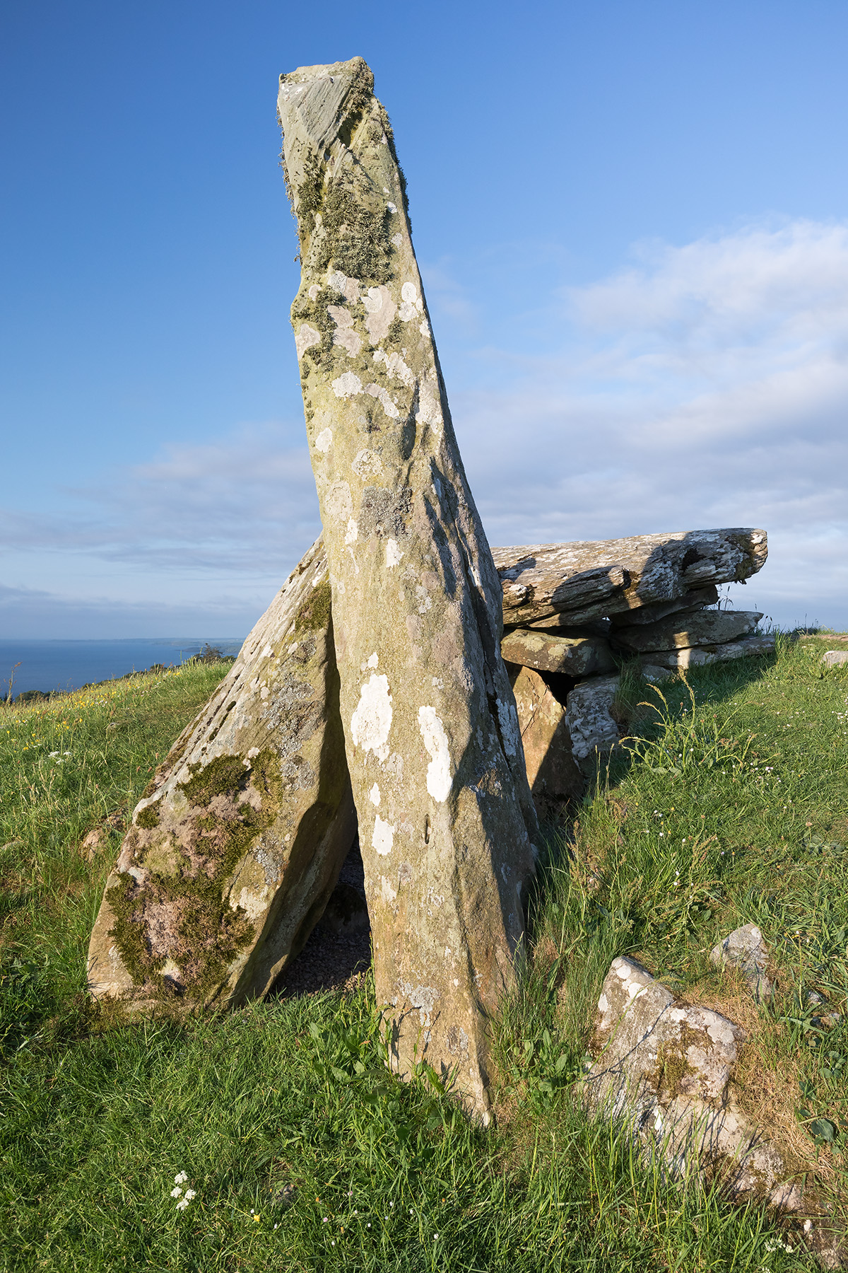 Early morning summer sunshine lights up Cairnholy II Neolithic chambered tomb.