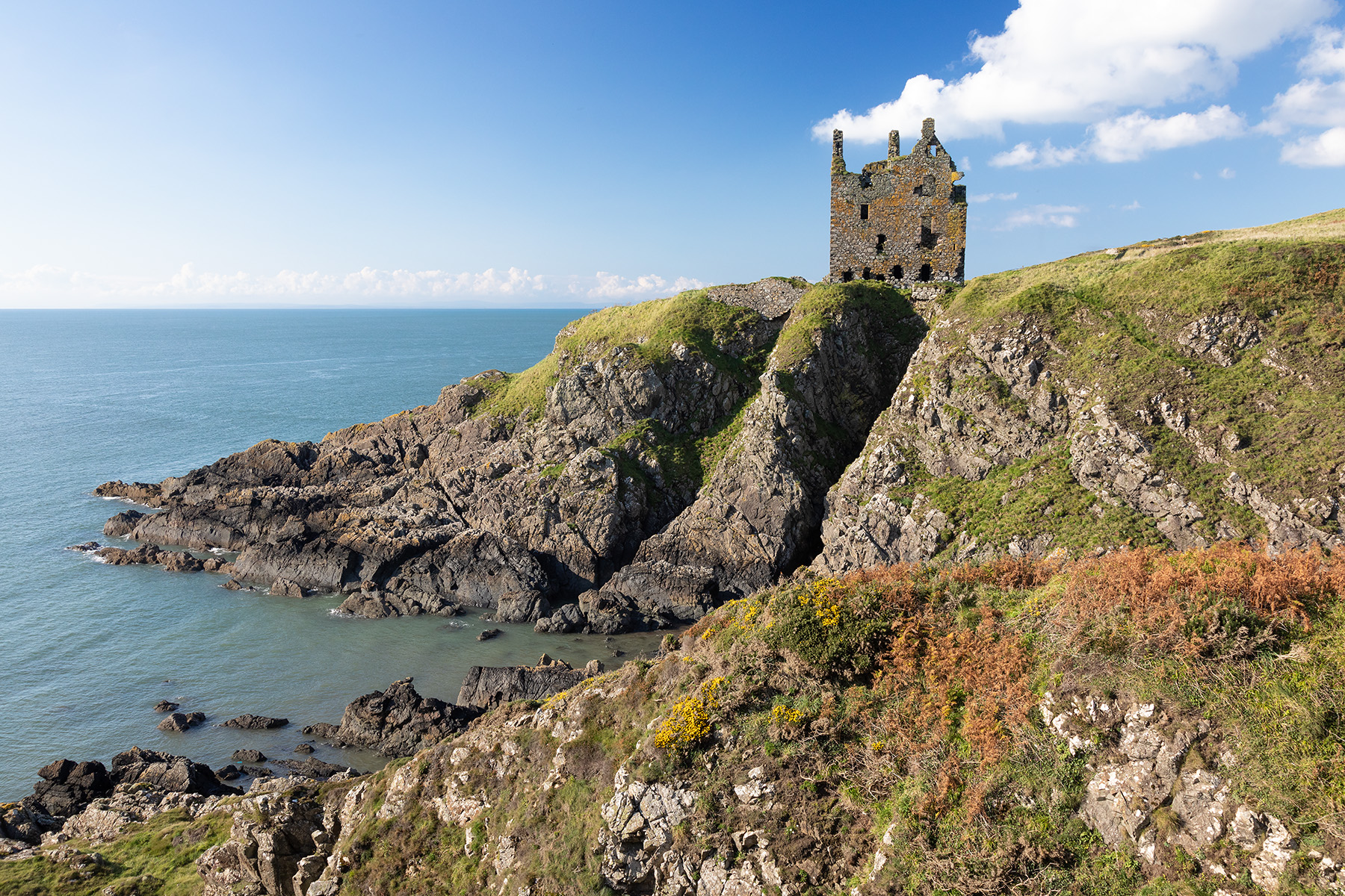 Perched on the edge of a cliff on the Rhins of Galloway, Dunskey Castle has been a ruin for over three hundred years. With a violent history, it has its fair share of ghost stories, including the inevitable piper who can be heard in appropriately stormy weather. In clear weather, Ireland is visible to the west.