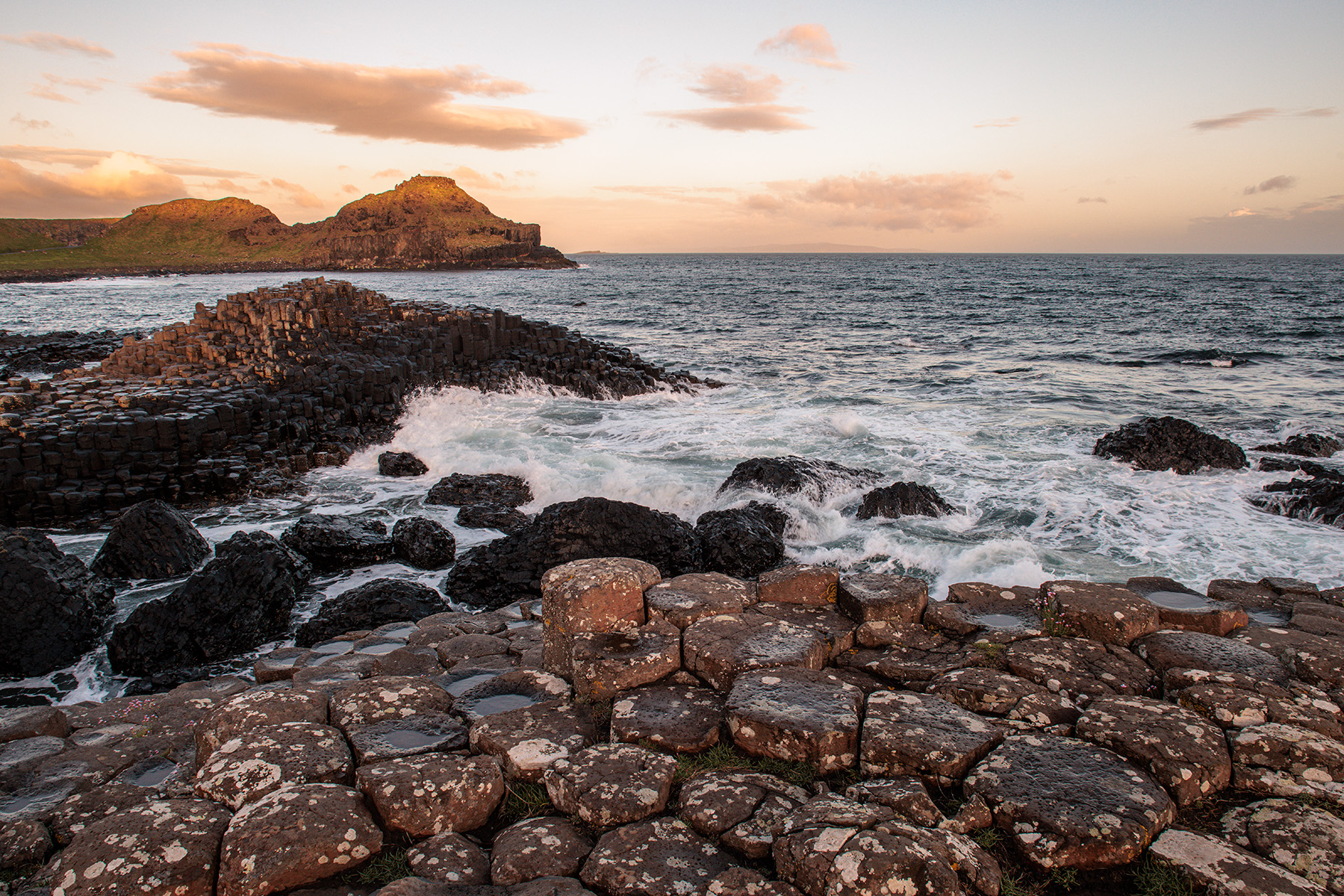Early morning sunshine beginning to light up the Stookans, named for their resemblance to hay stacks, and which form prominent landmarks to the west of the basalt columns of the Giant's Causeway.