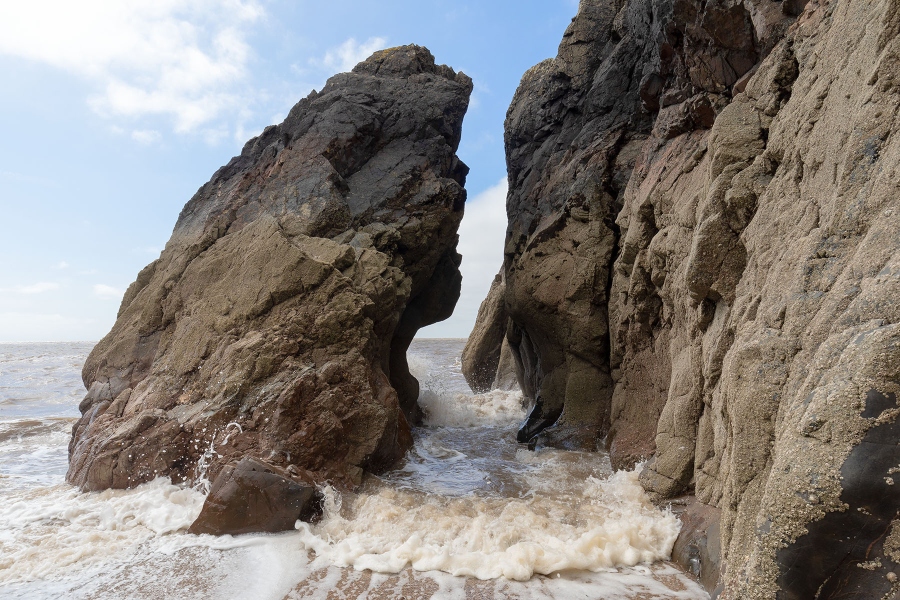 The rising tide can move very fast, so care is required when exploring the rock formations below the low cliffs on the Colvend Coast between Rockcliffe and Sandyhills.
