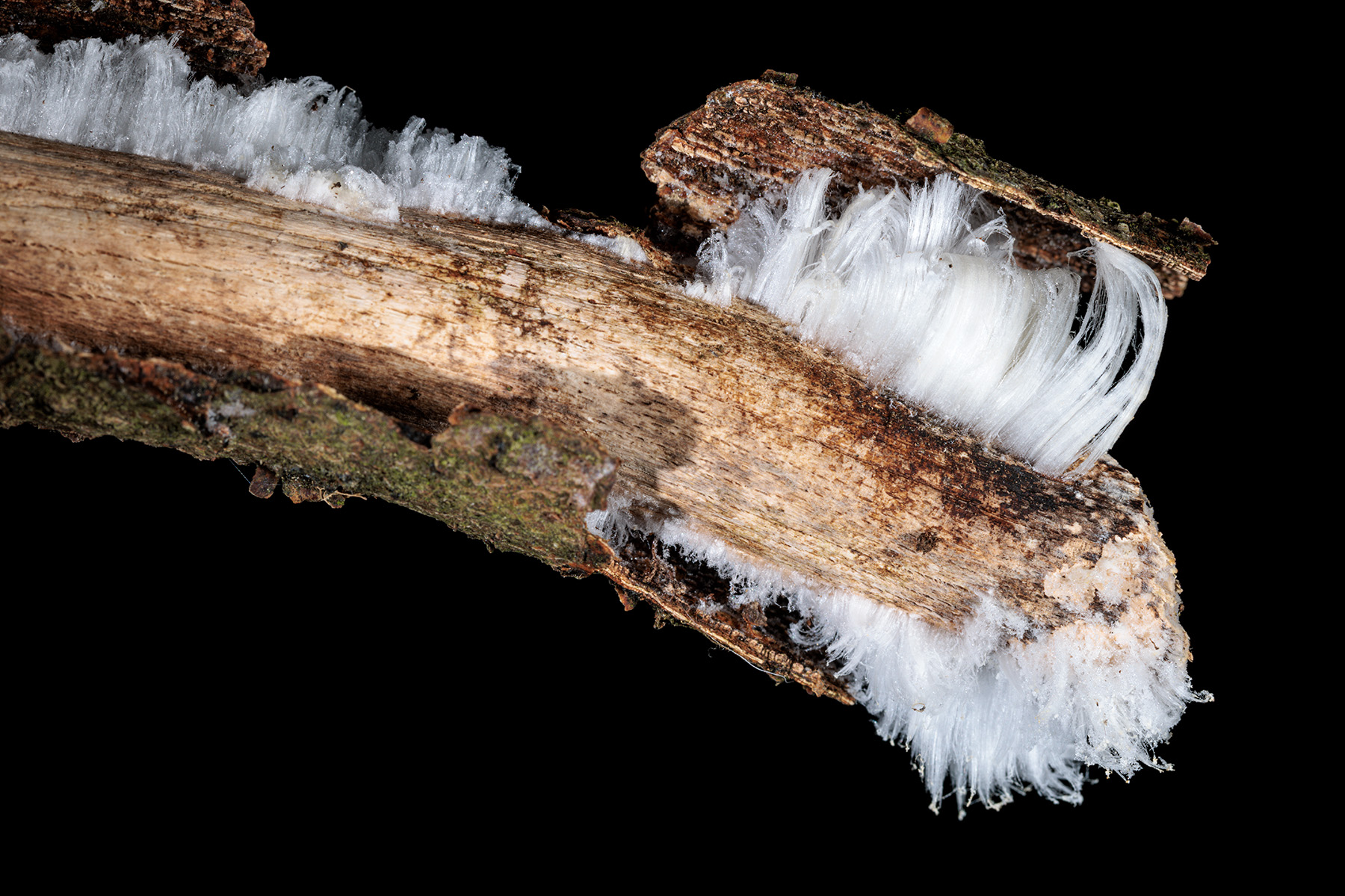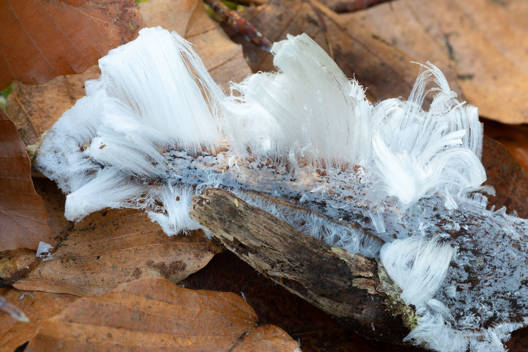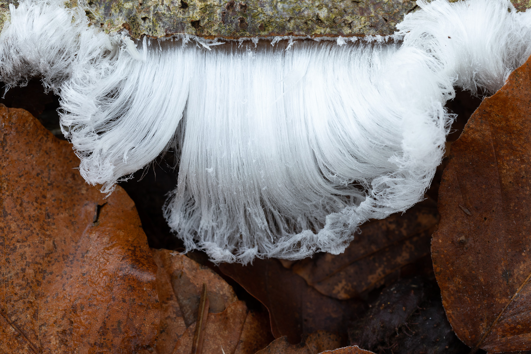 Exidiopsis effusa may sound like a spell cast by an outraged Hermione Grainger, but it’s actually the name of the fungus which Hofmann and her colleagues found in all of their hair ice samples. The extrusion of hair ice depends on capillary action at the outside ends of the medullary rays, fine tubes which run laterally across the growth rings from the centre of the branch. Hair ice does not form on softwoods, because the medullary rays are too narrow.