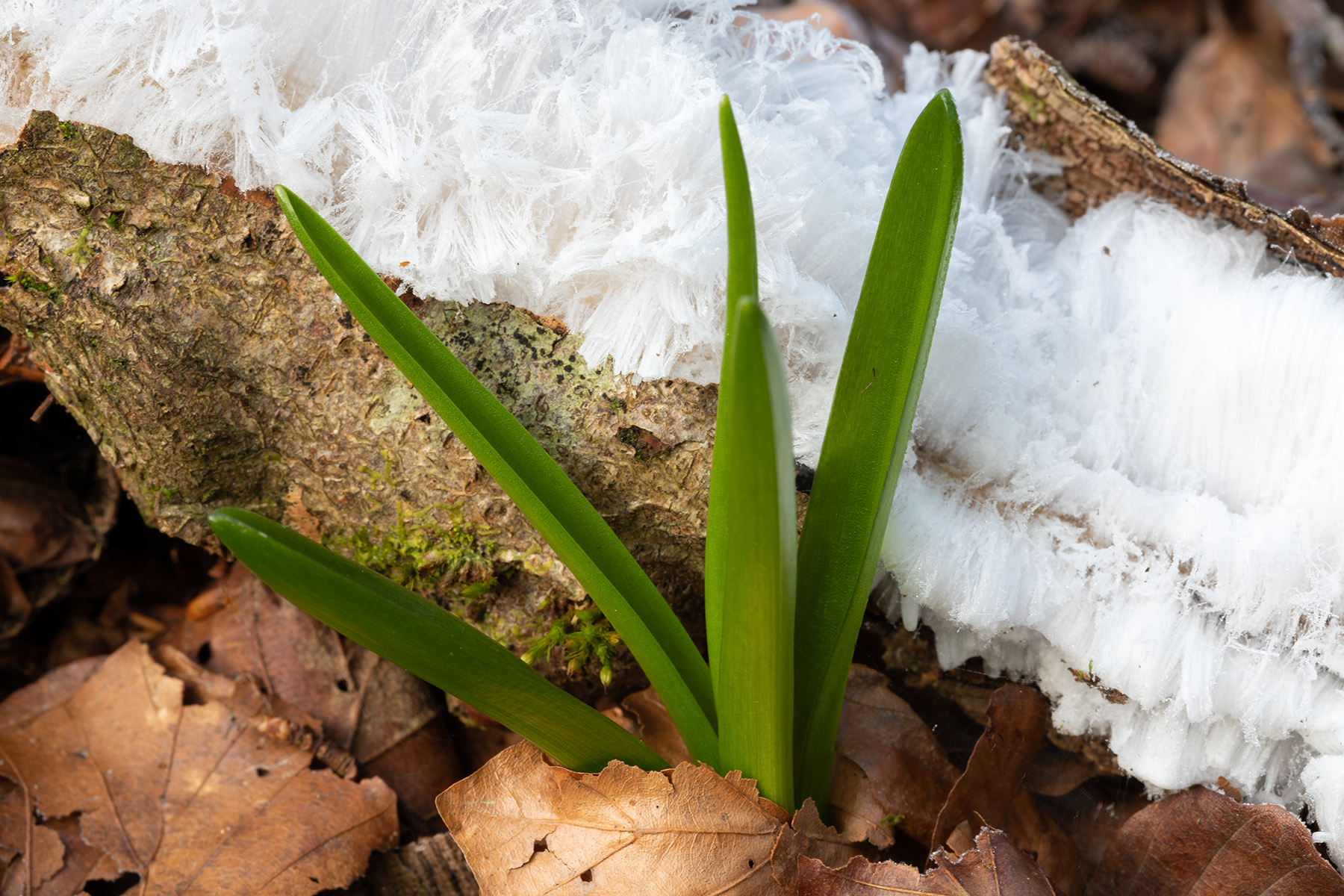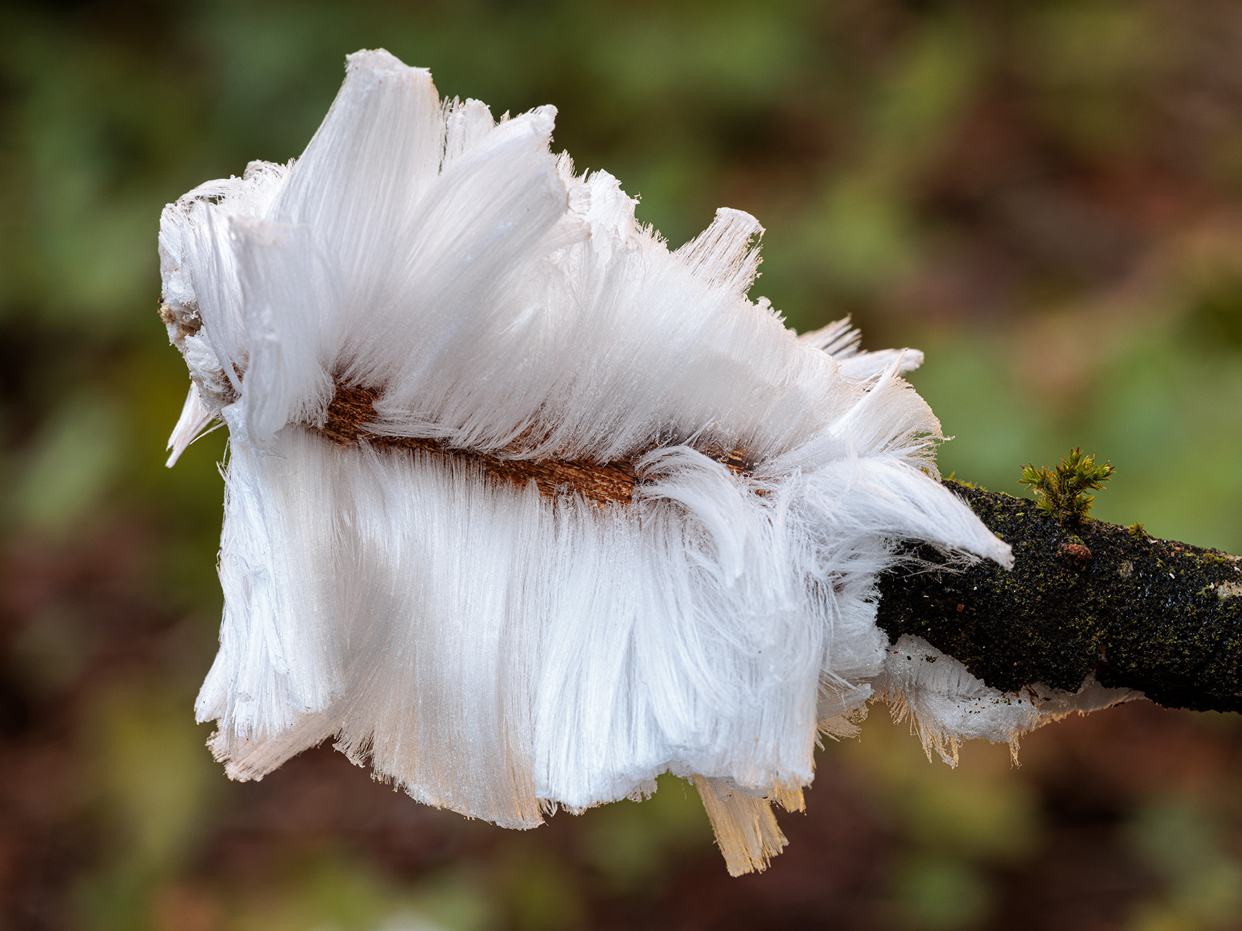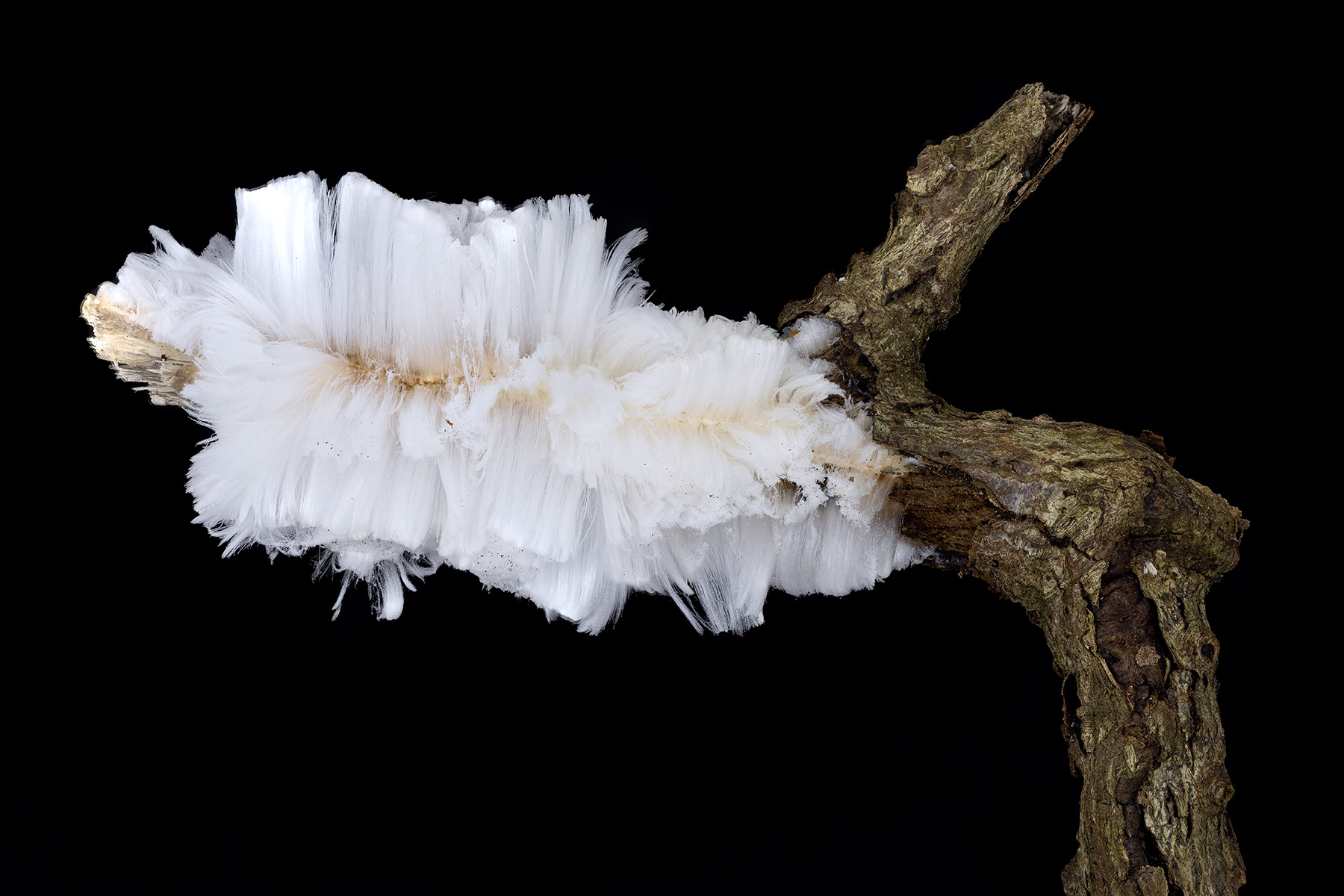 Exidiopsis effusa may sound like a spell cast by an outraged Hermione Grainger, but it’s actually the name of the fungus which Hofmann and her colleagues found in all of their hair ice samples. The extrusion of hair ice depends on capillary action at the outside ends of the medullary rays, fine tubes which run laterally across the growth rings from the centre of the branch. Hair ice does not form on softwoods, because the medullary rays are too narrow.