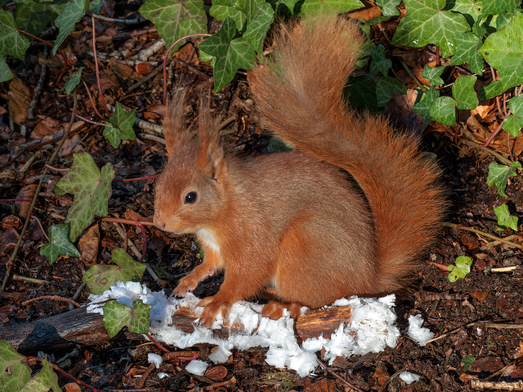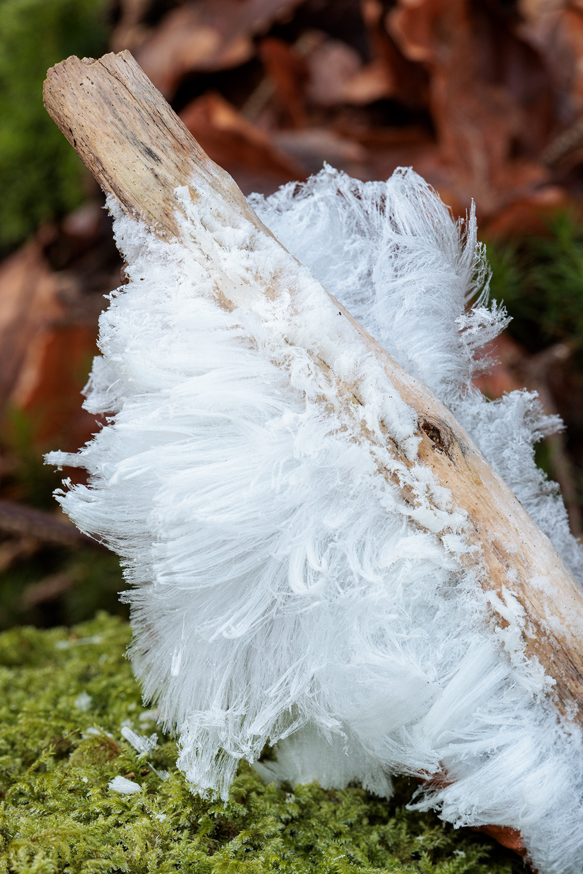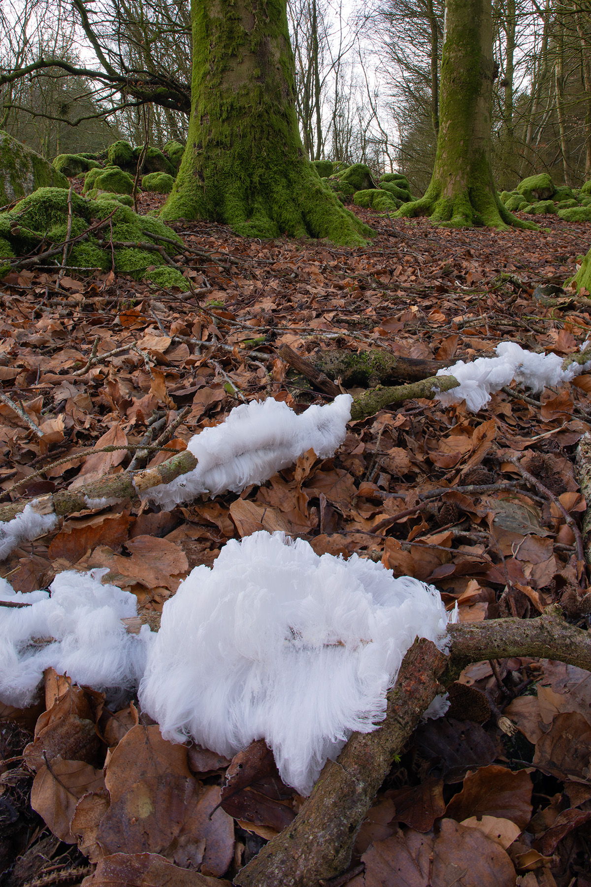 Hair ice is a remarkable phenomenon, found on dead wooden sticks from only a few broadleaved tree species. It occurs within a limited geographical range, and only when the temperature of the air falls below 0°C. A very thin film of liquid remains on the surface pores of the wood, while a continuous extrusion of fine strands forms as water from within the wood freezes on contact with the atmosphere. The process halts if the air temperature drops below -4°C. In Galloway, where I live, almost all of the hair ice that I’ve seen has been on dead twigs and branches of beech (Fagus sylvatica) although I have come across it a few times on rowan (Sorbus aucuparia) and birch (Betula spp). Hair ice may form on thin twigs or on fairly thick branches, either lying on the ground or still attached to the tree, but never on living parts of the tree.
