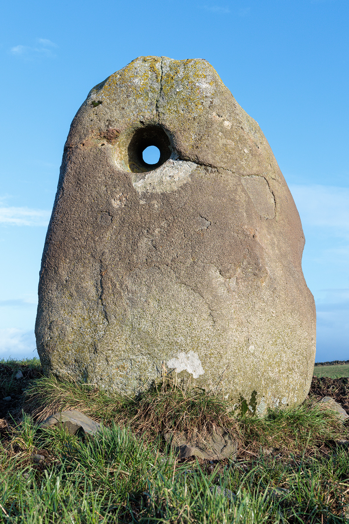 Marked on the Ordnance Survey map in gothic script as a ‘hole stone’, it’s a big stone with a hole in it. Dating from the Neolithic, it’s similar to one in Co. Antrim.