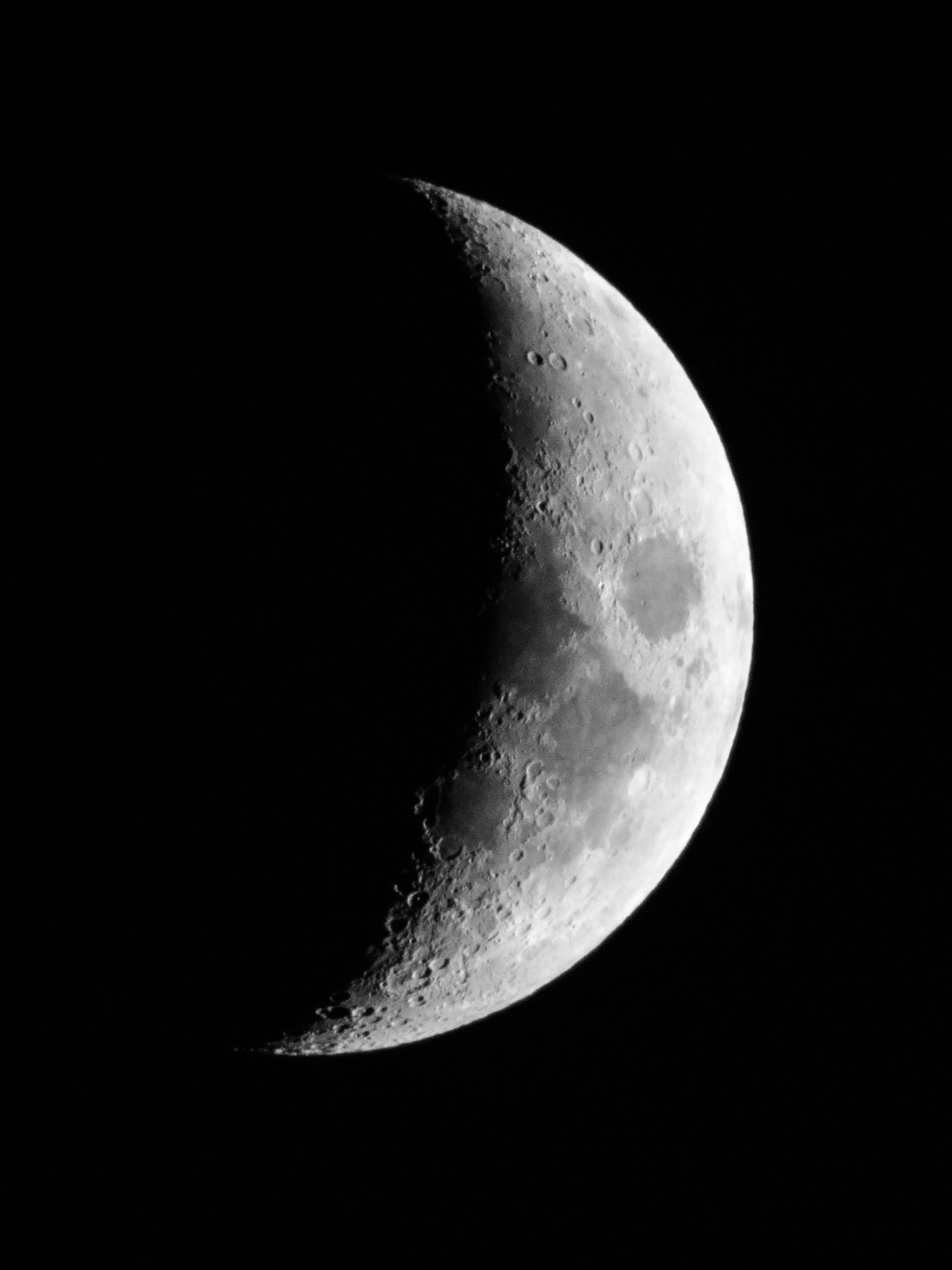 In this image of a waxing crescent moon, the Apollo 11 landing site on the Sea of Tranquillity is in darkness just beyond the terminator between night and day, but the Apollo 17 site on the edge of the Sea of Serenity is illuminated by the Sun close to the horizon, so craters are visible in sharp relief.