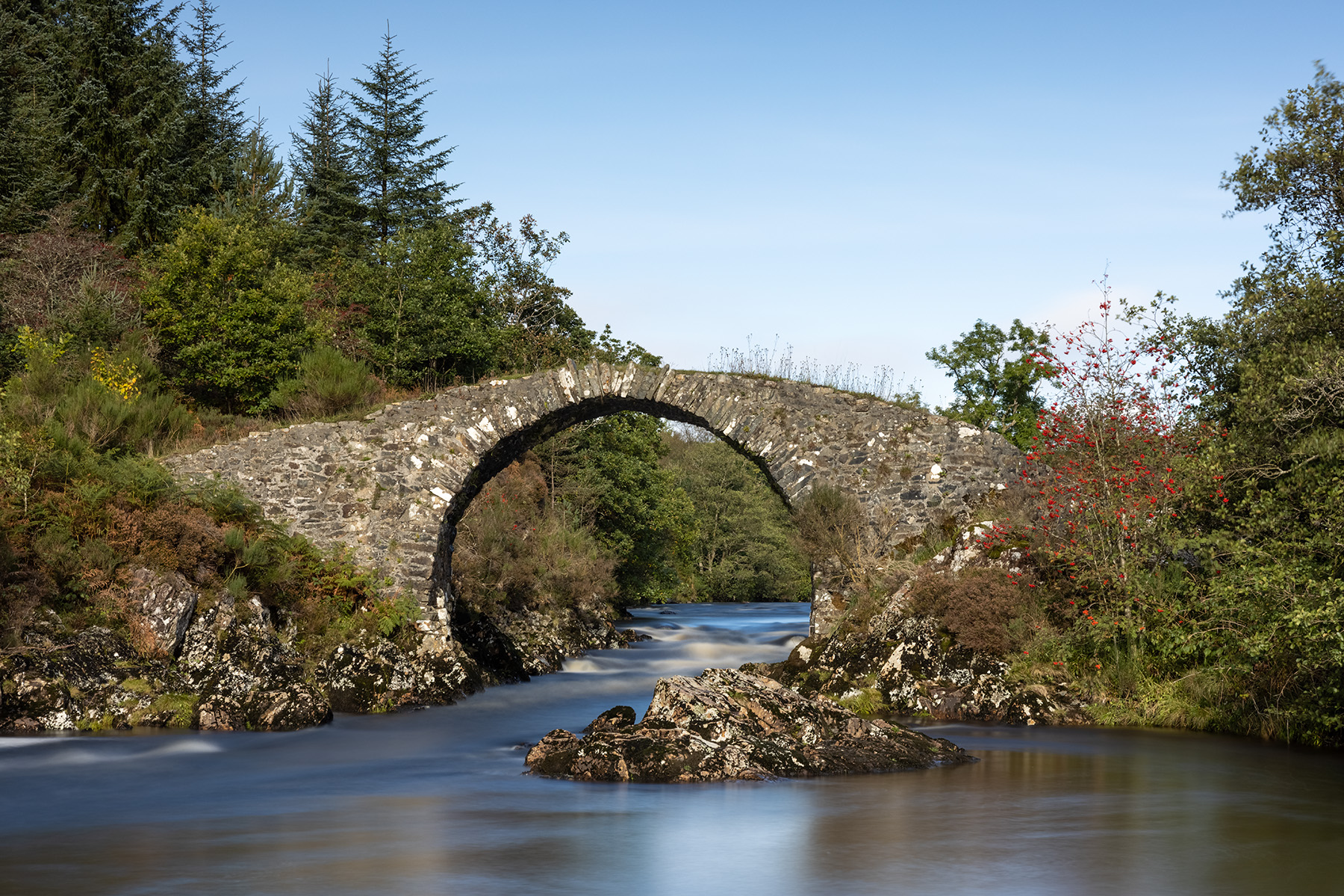 The old packhorse bridge over the Water of Minnoch is now surrounded by forest, with little remaining of the tracks on either side.