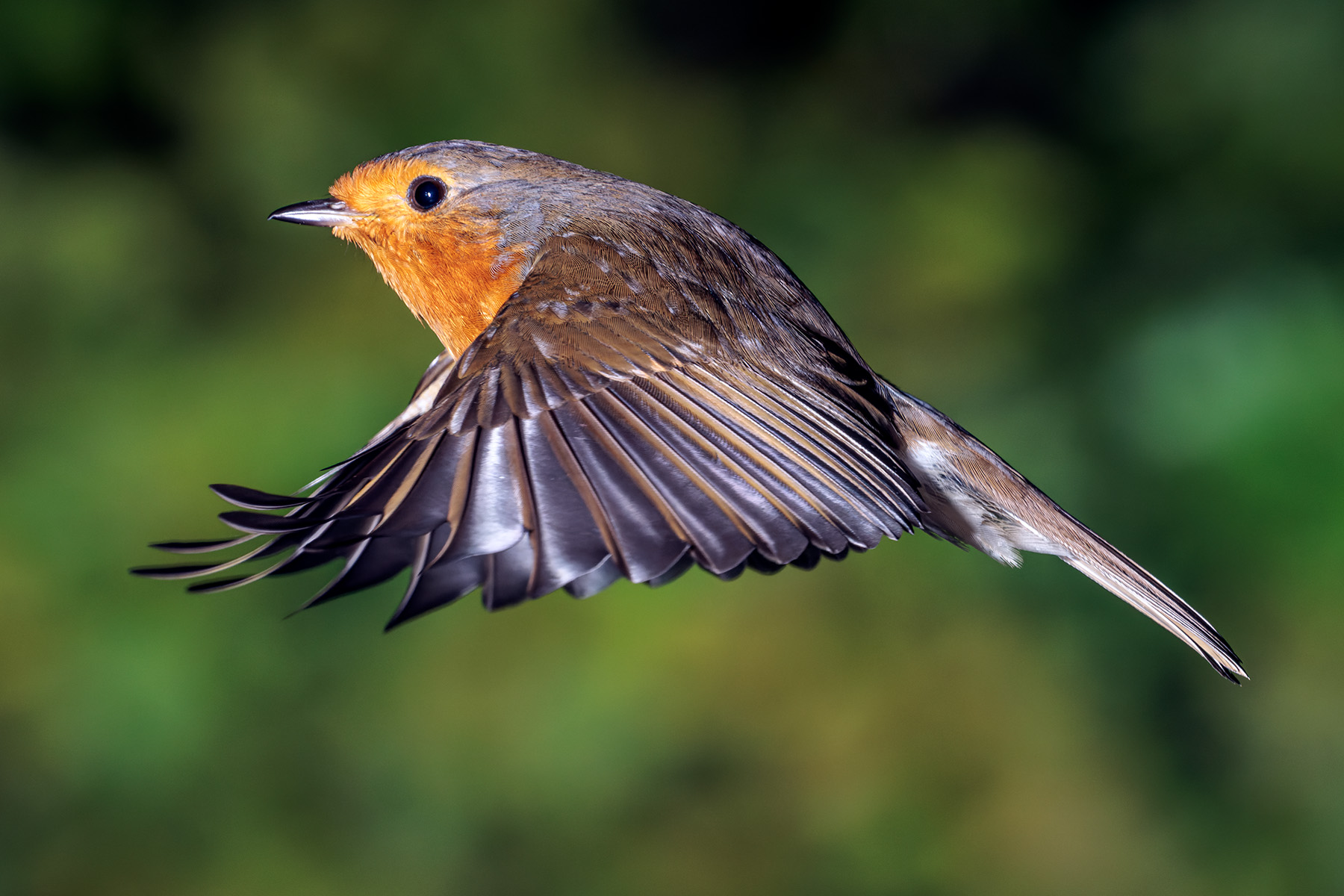 This robin on a short flight in a Scottish woodland has its wings near the bottom of the downstroke, providing both lift and forward thrust. Between wing beats, robins often hold the wings briefly in a folded position, for a short period of free fall.