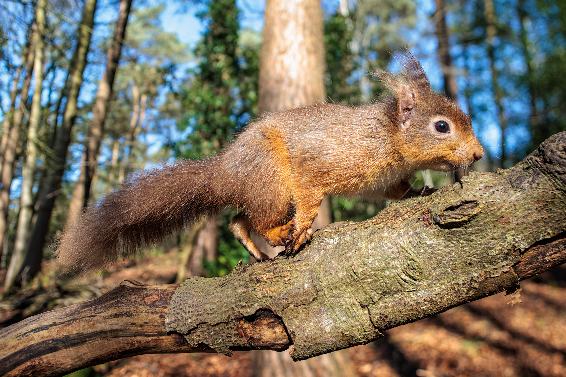 A red squirrel running along a dead beech branch in a mixed woodland.