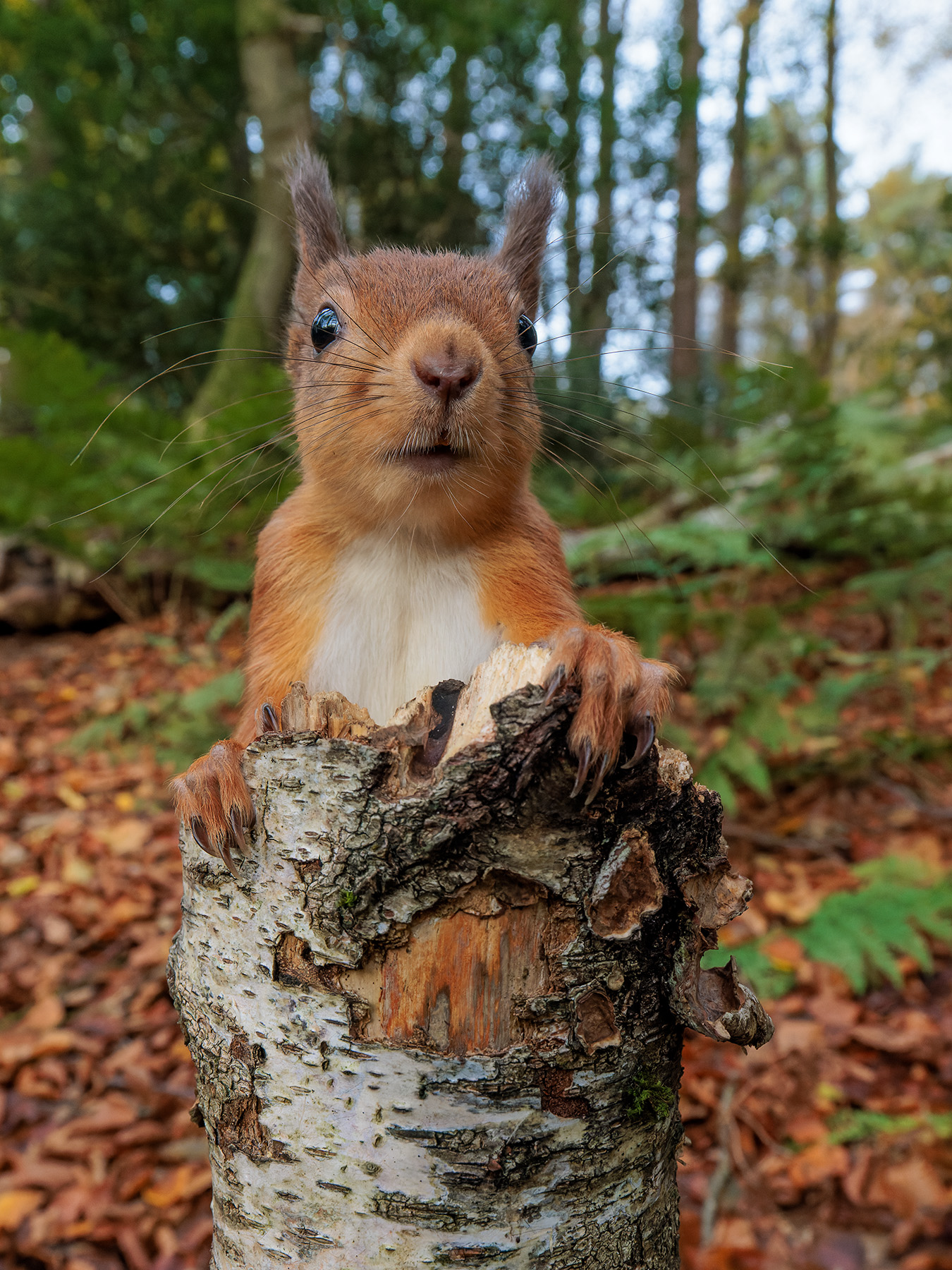 Red squirrels are highly inquisitive and will investigate anything which appears in their familiar territory, in this case a tripod supporting a camera with a wide angle lens, and with a single hazel nut on the camera’s hot shoe. I was standing a short distance away, with a radio transmitter to trigger the camera. This photo was taken as Scotland was preparing to host the COP26 conference, and the squirrel’s pose reminds me of the stress of standing at a lectern at a scientific conference.