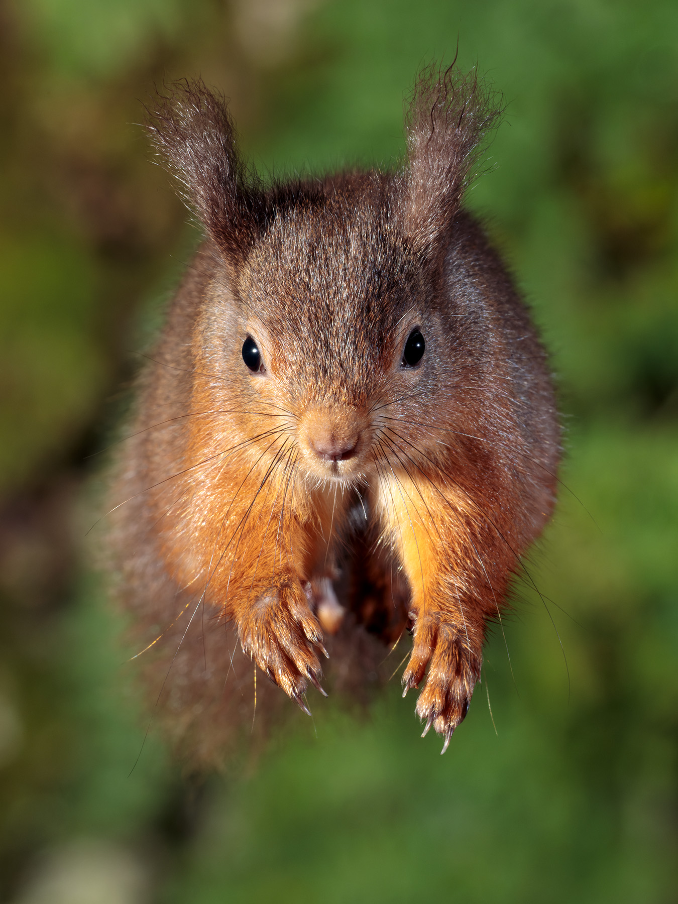 Red squirrel jumping towards the camera, which was triggered by a home-made gizmo which trips the shutter for a single exposure as the squirrel flies through a beam of light. Both the squirrel and the background, a stone wall covered in moss and ferns, are illuminated by a very brief flash of light from adapted flashguns. Precise timing is necessary, together with a little luck, because a squirrel travelling at between 2 and 3 metres per second passes through the approximately 5mm plane of sharp focus in about 1/500 second.