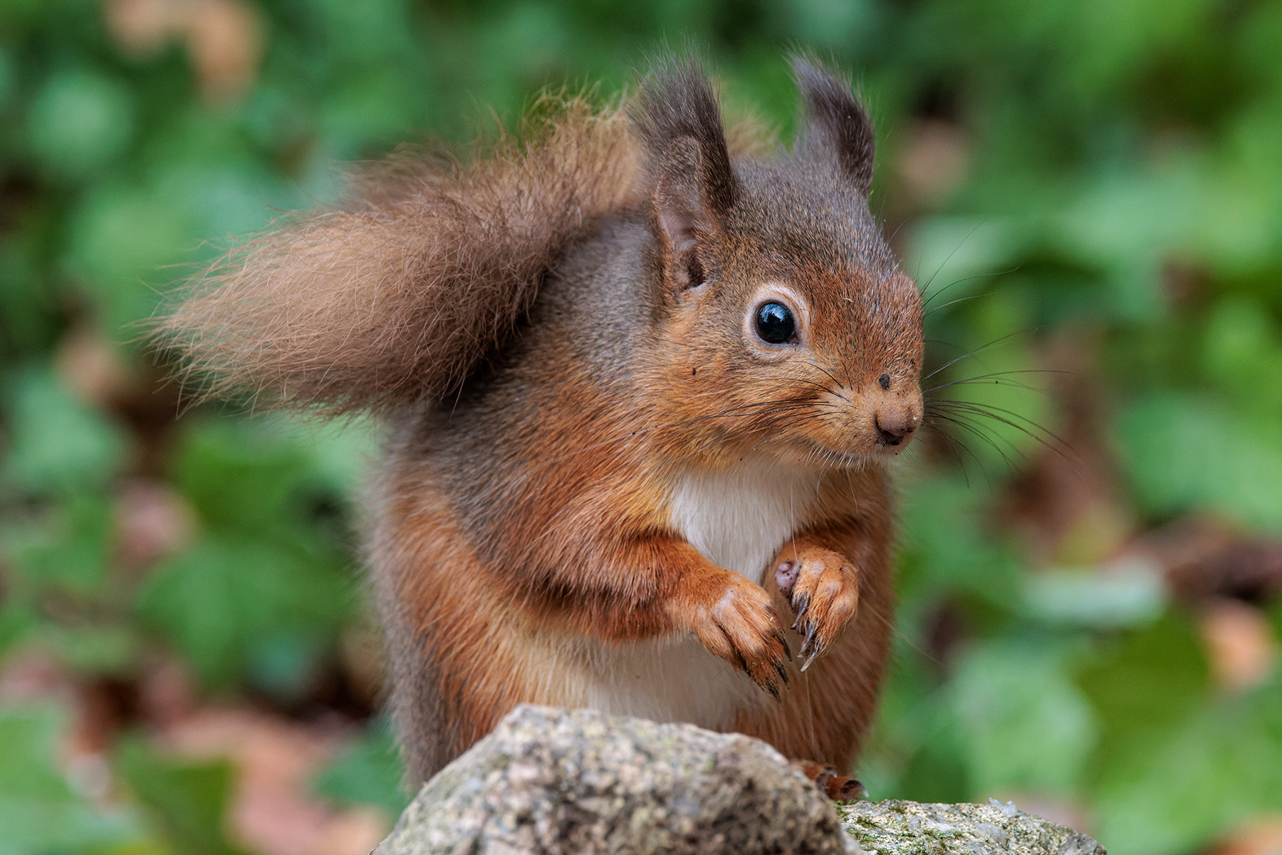 A red squirrel sporting a debonaire over-the-shoulder fashion statement.