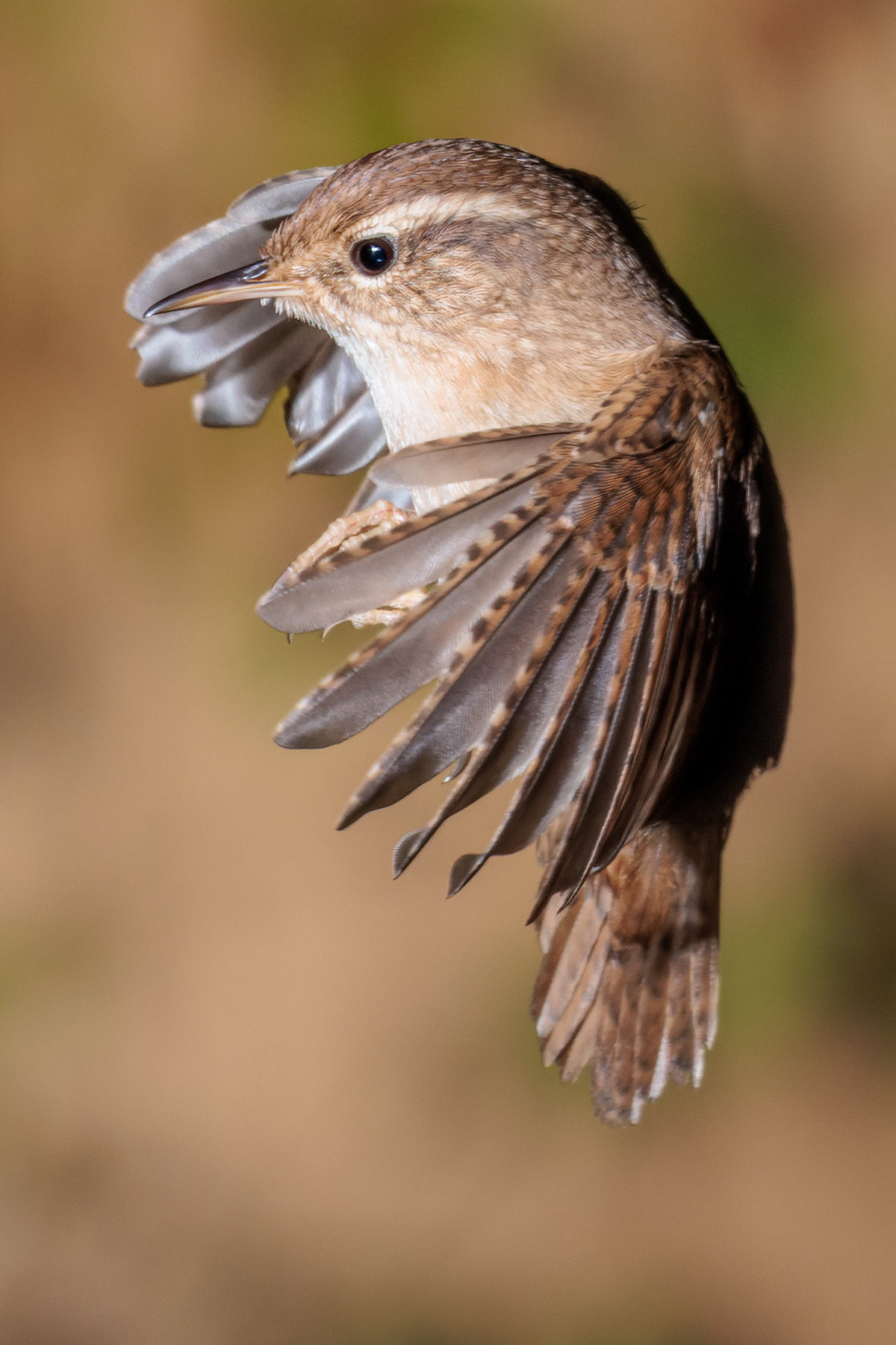 The wren is Britain’s most abundant bird and almost its smallest. This one is applying its wings and tail as air brakes as it approaches a landing perch.